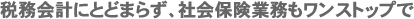 社会保険・労働保険事務手続、労務管理・従業員教育等の社会保険労務士業務についても併設の社労士事務所で手がけており、税務と社会保険・労働保険の相談窓口の一本化により関与先様の利便性向上に資するとともに、両分野に跨る問題についても税理士・社会保険労務士双方の視点から分析を加えることで、最適な解決策作りを支援いたします。
